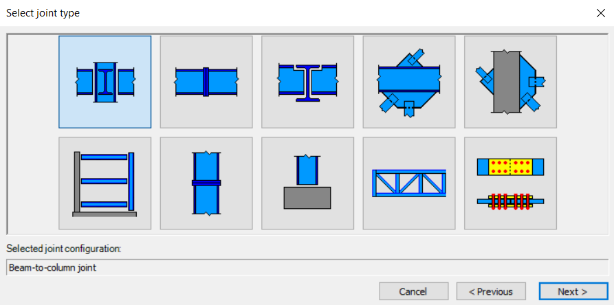 The type of the joint has to be defined on the next dialog. csJoint can handle great variety of joint types, which covers nearly the whole joint standard Eurocode 3 Part 1-8.