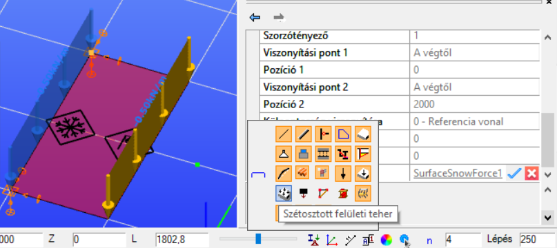 A Vonalmenti megoszló teher dialógon található Terhek elhelyezése () gomb megnyomásával a vonalmenti hóterhek elhelyezésre kerülnek az előzőleg kiválasztott szerkezeti elem(ek)re.